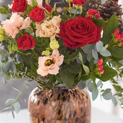 A gorgeous amber-like flecked vase filled with fresh flowers in classic Christmas colours, arranged by a florist.